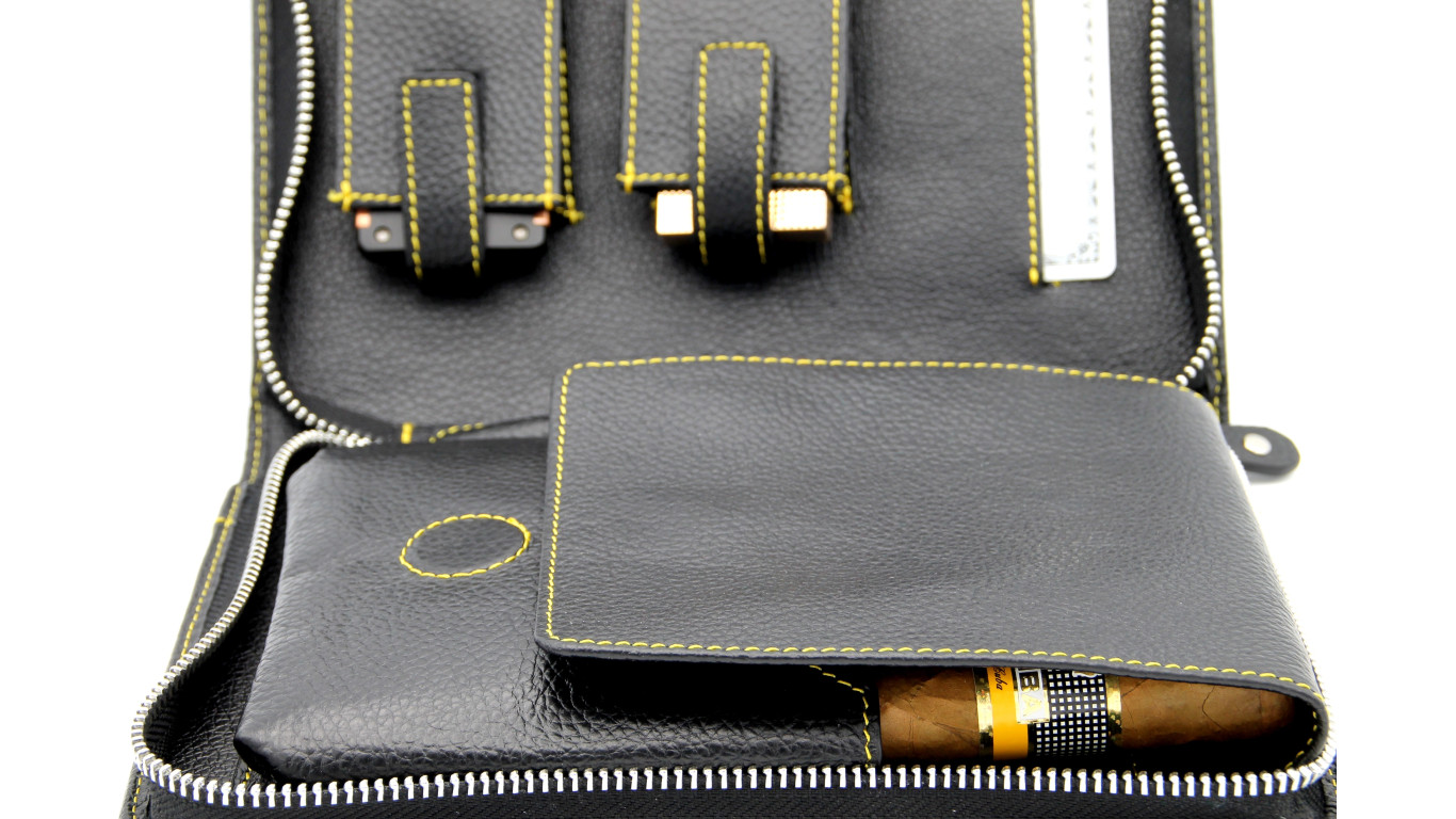 Beautifully black genuine leather is accented by yellow topstitching on this variant of the adorini Cigar Bag for a unique color scheme that is both elegant and modern. The black and yellow combination is a nod to that most iconic of Cuban cigar brands, making for the ultimate travel case for cigar connoisseurs, who can add a Boveda pack for extended adventures.