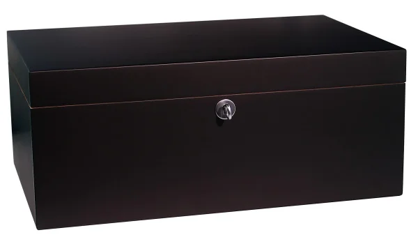 This modern and functional humidor from the adorini Basic series in size L impresses with its matte black finish and versatility. With space for approximately 150 cigars or even smaller cigar boxes, it offers an ideal solution for safely storing your cigars. It comes with an analog hygrometer and a passive sponge humidifier. The hygrometer measures humidity using a metal coil and, together with the humidifier, is magnetically and flexibly attached to the humidor lid. The humidor is also equipped with a lock to protect against unauthorized access. A double set of keys is included so you have a spare key. The humidor features matte silver hinges inside and a particularly strong sealing lip, which ensures optimal humidity retention. A vertical divider allows for additional compartmentalization of the interior. An additional, removable tiered stand organizes the humidor in an aesthetic and functional way. It is removable and equipped with ventilation grooves for optimal humidity circulation.
