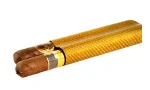 تثير حقيبة السيجار المصنوعة من الكربون الخفيف والمطلي بالذهب اللامع الإعجاب بأناقتها العصرية. توفر مساحة تتسع لسيجارين، وتم تصميمها خصيصًا لاستيعاب السيجارات ذات القطر الحلقي الأقصى 2.5 سم. يمكن تخصيص طول الحقيبة من 15.5 سم إلى حوالي 21 سم.