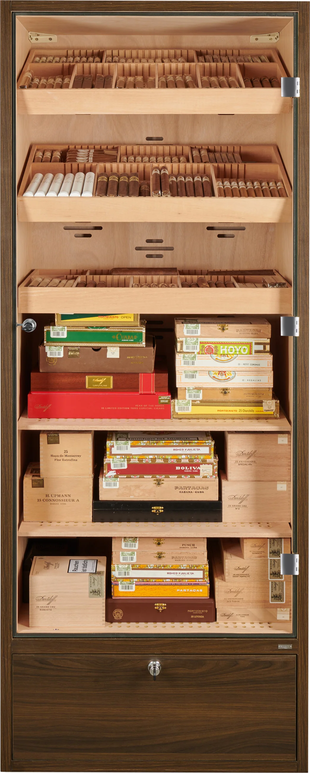 The base of the humidor cabinet contains a lockable drawer that can be used for storing cigars as well as accessories or consumables such as distilled water. The drawer bottom is perforated and separated from the interior, allowing humidity to circulate and ensuring safe cigar storage.