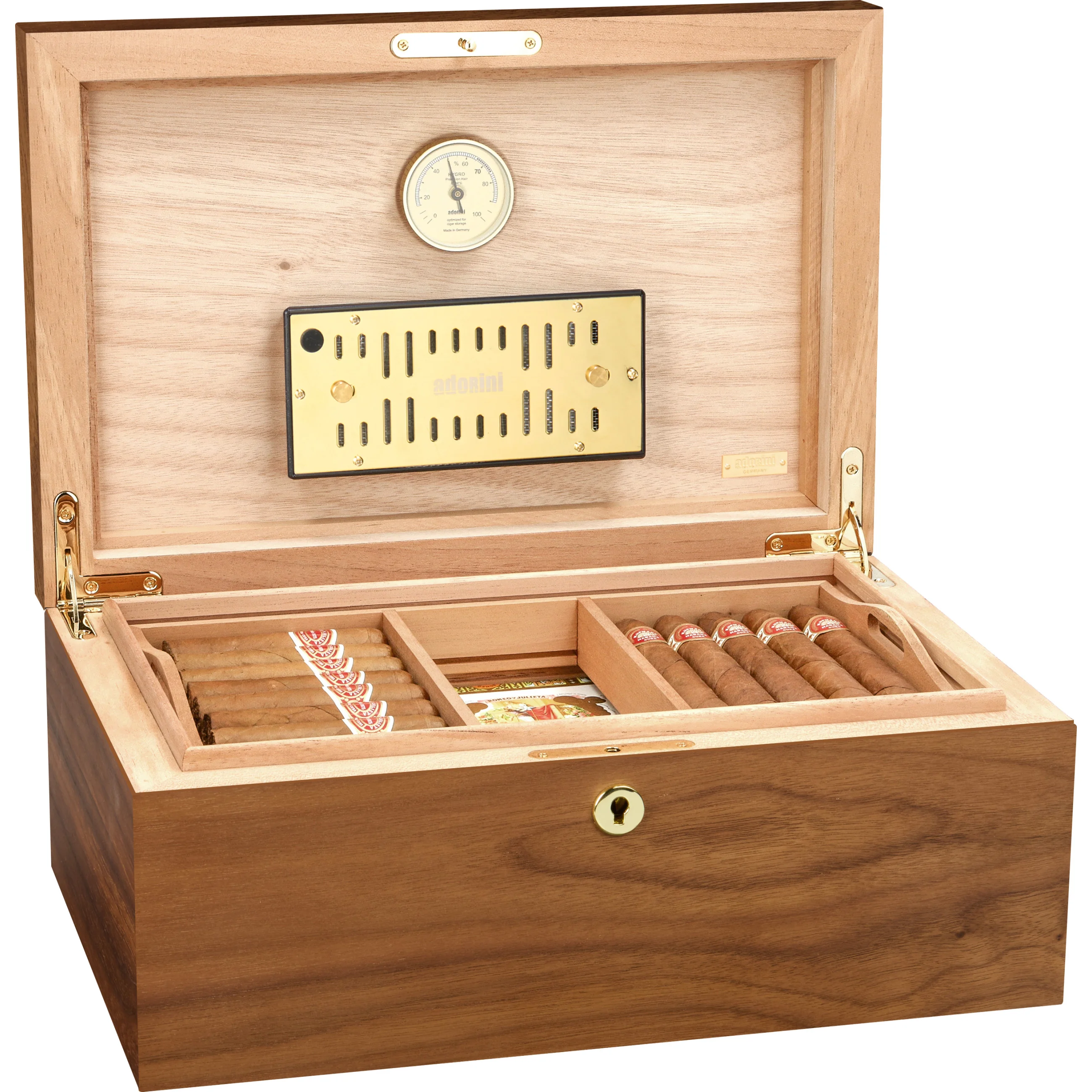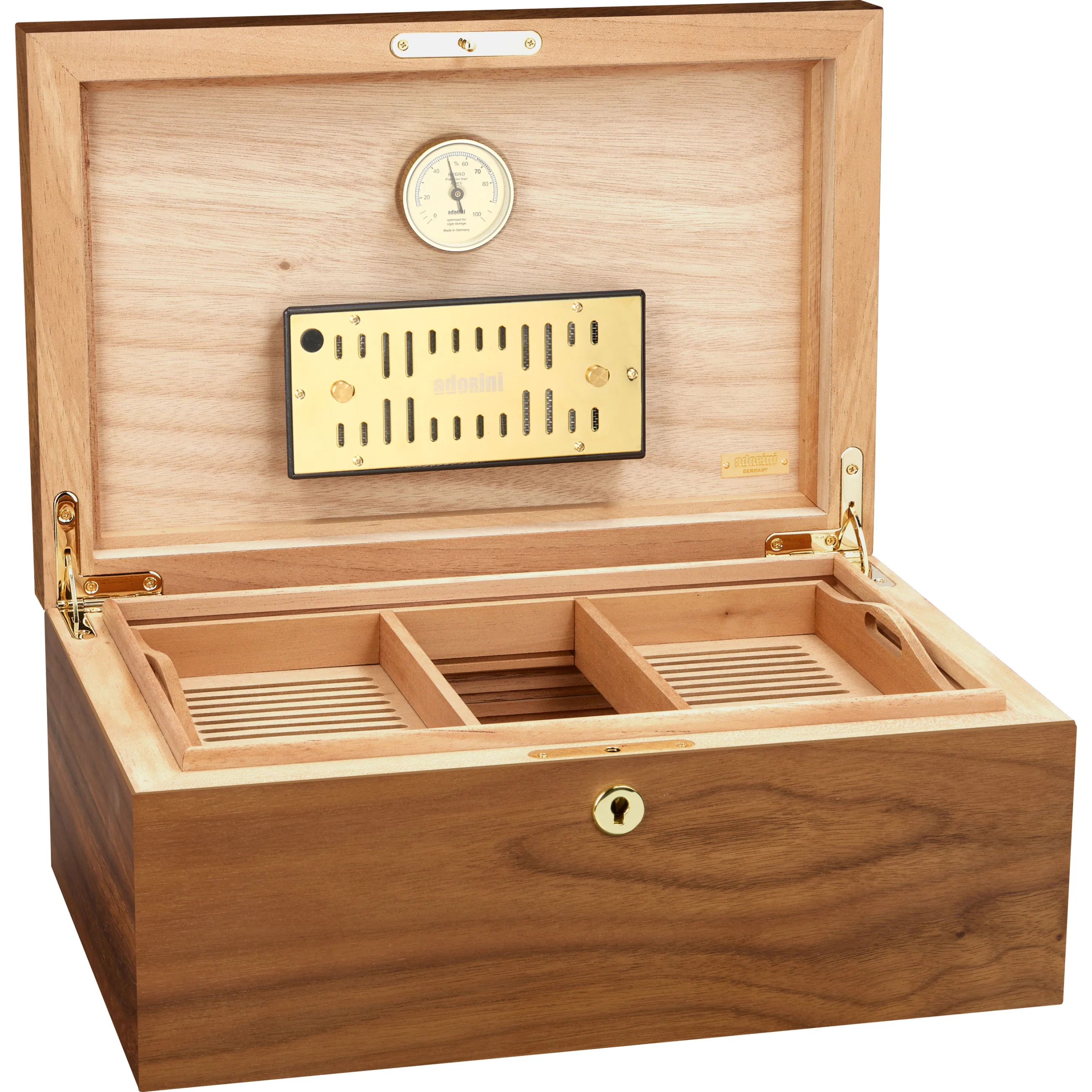 The adorini Humidor Ancona Walnut Grande Deluxe is an elegant Grande-size humidor that impresses with its attractive walnut veneer. Slight variations in grain and color highlight the natural character of the real wood veneer and make each humidor unique.