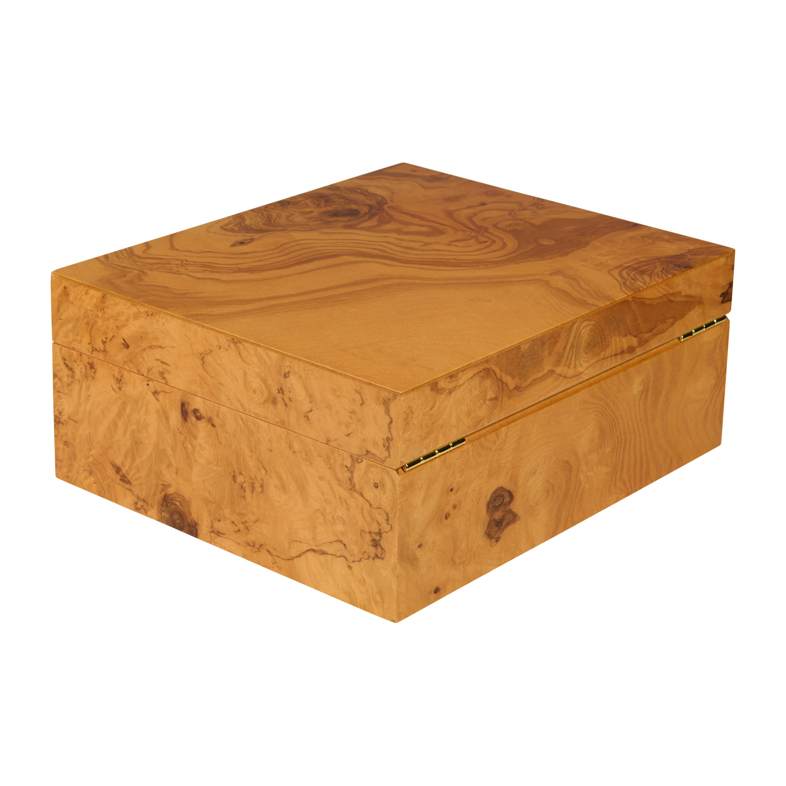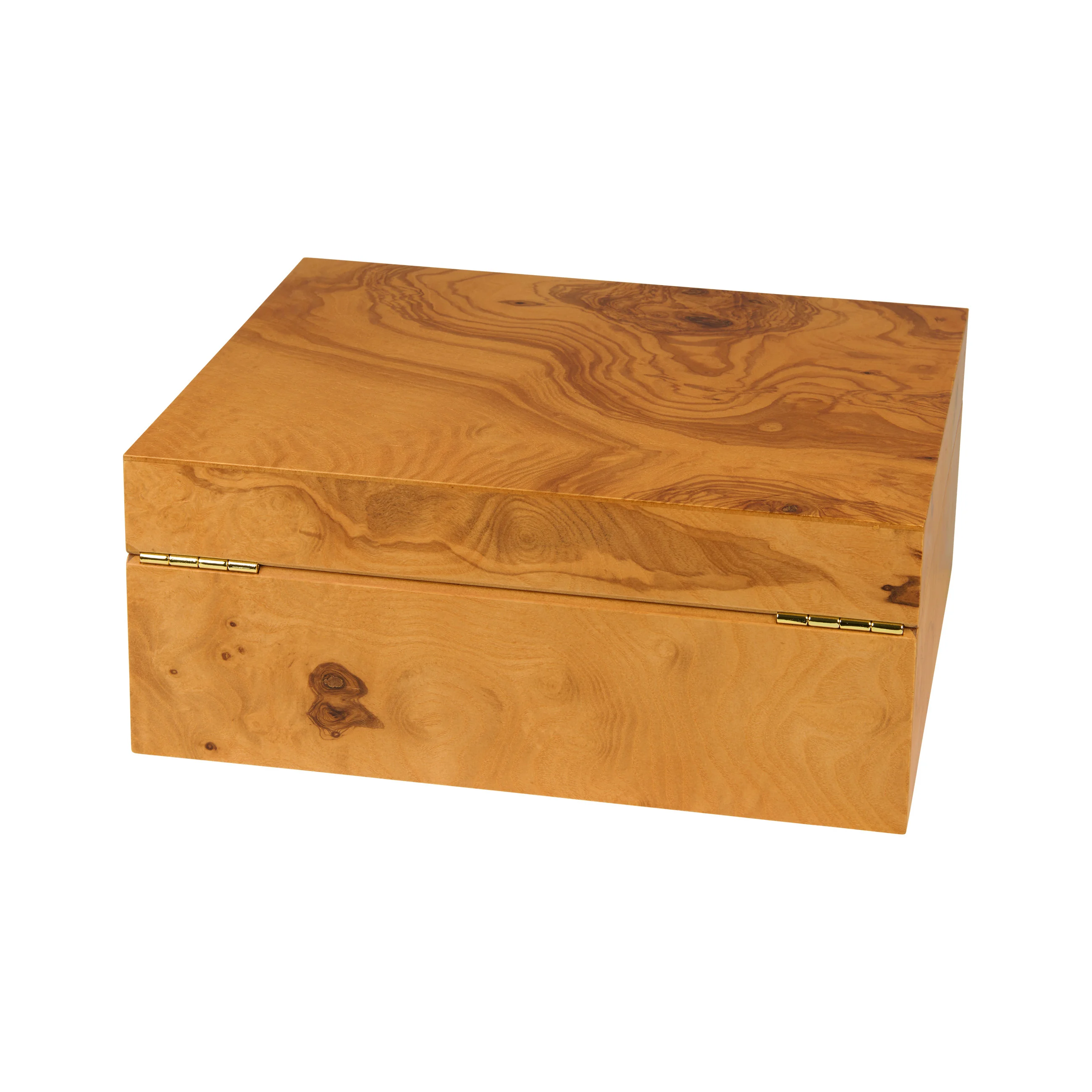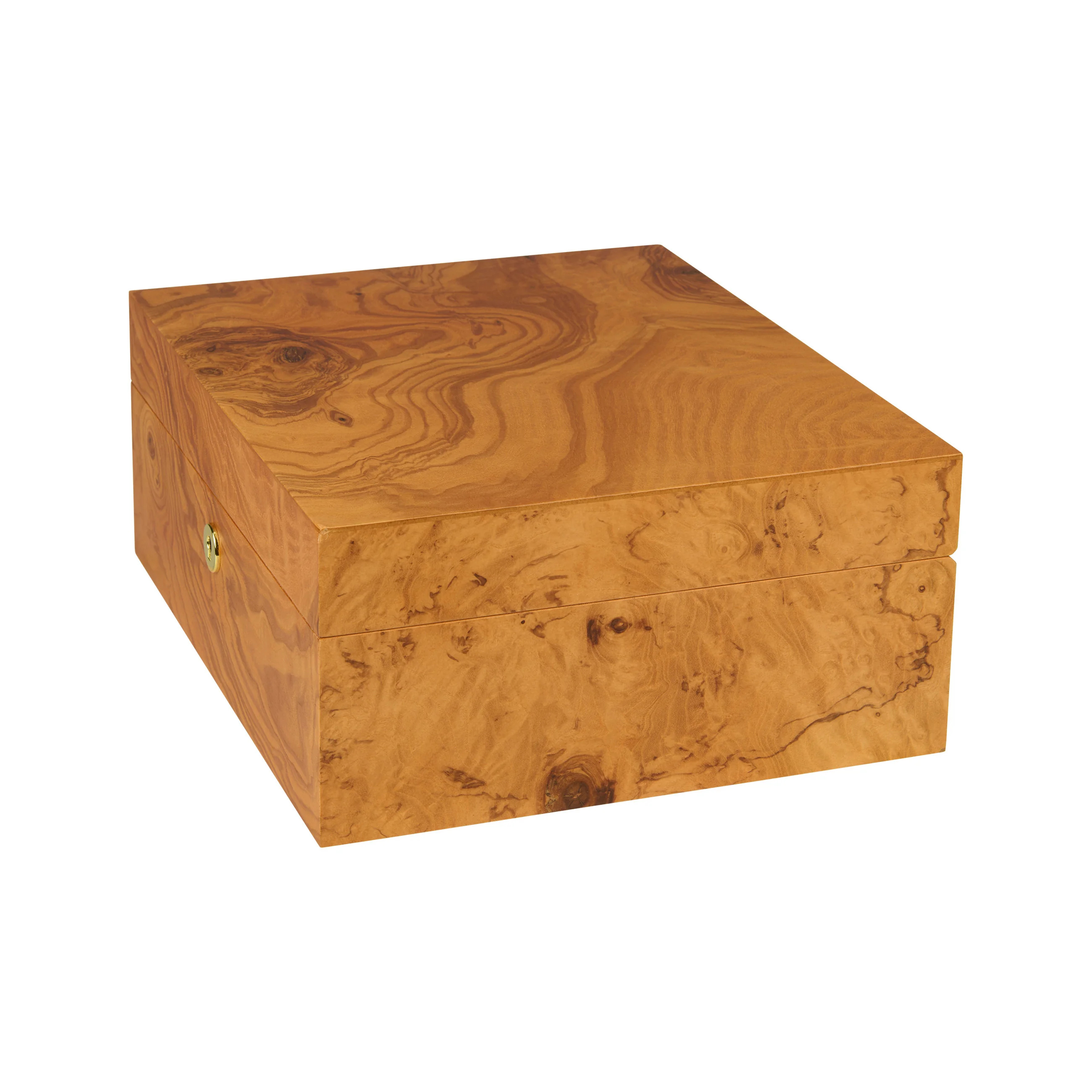 The olive wood impresses with its characteristic grain with honey-yellow to golden-brown tones, interspersed with dark, almost chocolate-colored veins. Thanks to its warm appearance, the humidor blends harmoniously into almost any setting. Medium-sized humidors hold up to 75 cigars, providing ample space for your cigar collection.