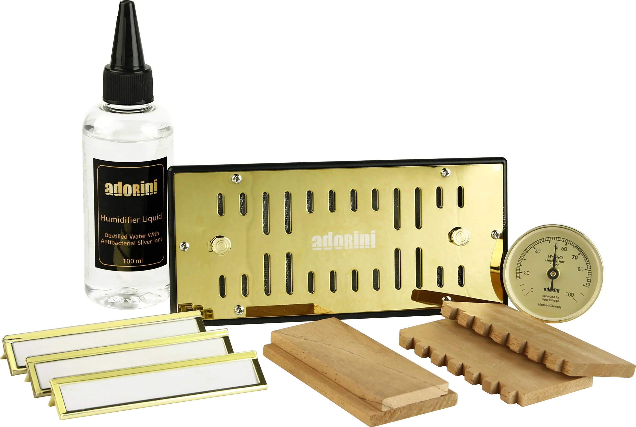 - Gold plated acryl polymer based Adorini Deluxe humidifier with adjustable ventilation openings for an optimum regulation of the humidity level
