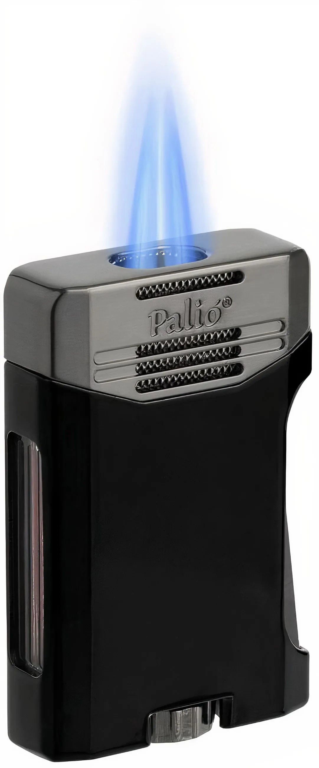 **Запалката Palio Antares Jet в черен цвят** е забележителна запалка от Palio с елегантен черен цвят с лек метален оттенък, който придава на тона допълнителна изтънченост. Оборудвана с два мощни, устойчиви на вятър пламъка, които се събират в остра точка, тя е идеална за запалване на пури. Логото на Palio е елегантно разположено в горната част на запалката, а въздухозаборниците горе и долу наподобяват автомобилна решетка, което допринася за уникалния ѝ характер. Тази запалка включва изключително голям резервоар и монтирано отстрани прозрачно прозорче за газта, което улеснява следенето на нивата на горивото и зареждането при необходимост. За оптимална и дълготрайна работа препоръчваме да използвате само газ бутан с висока чистота.