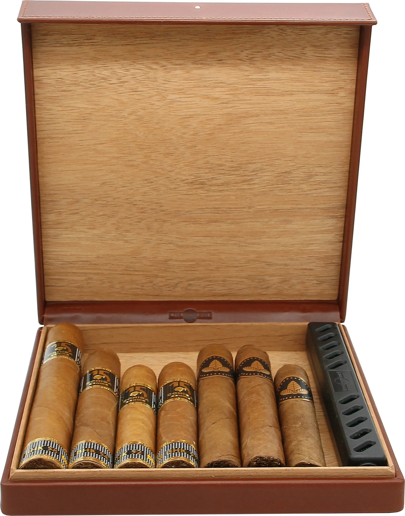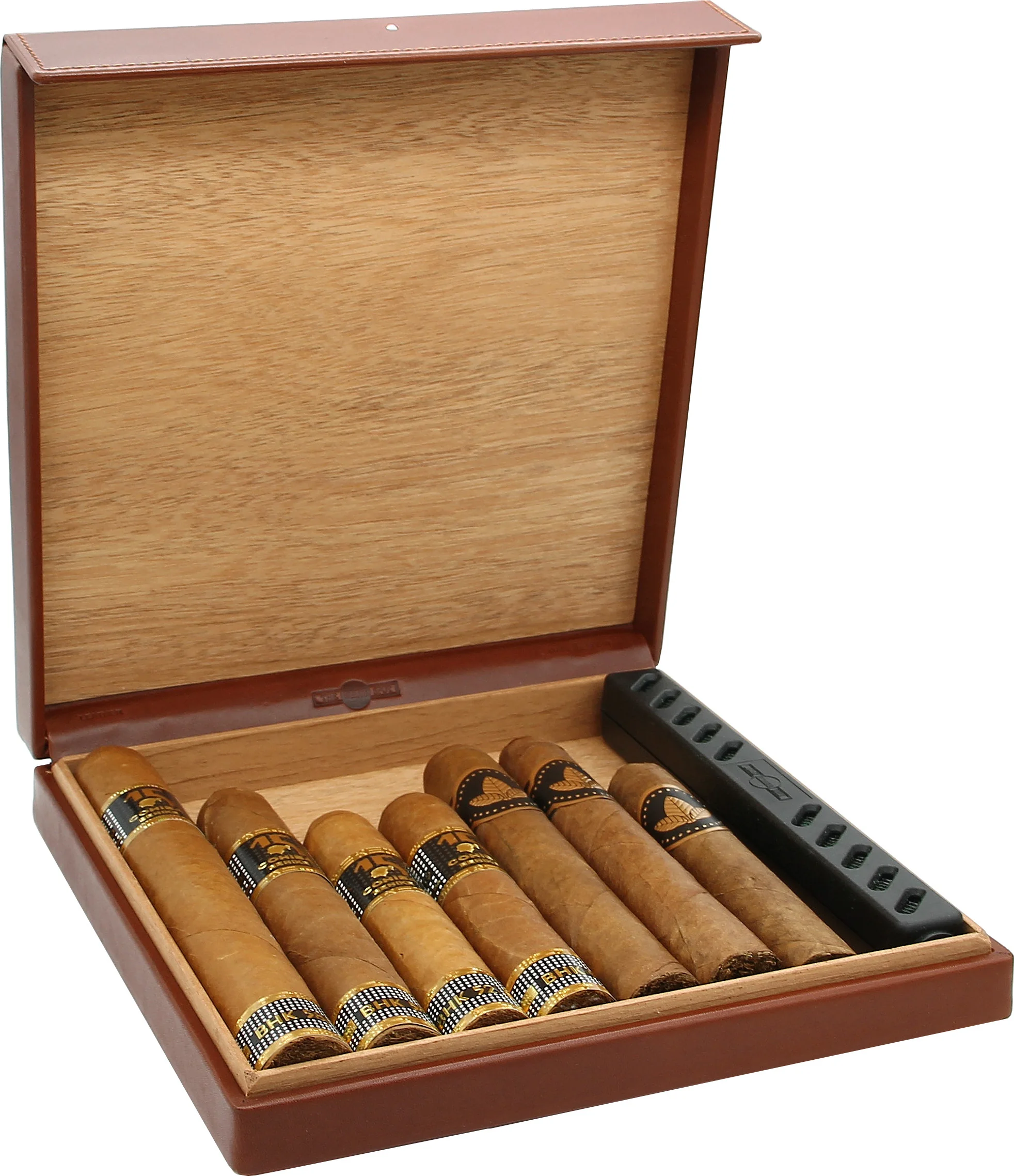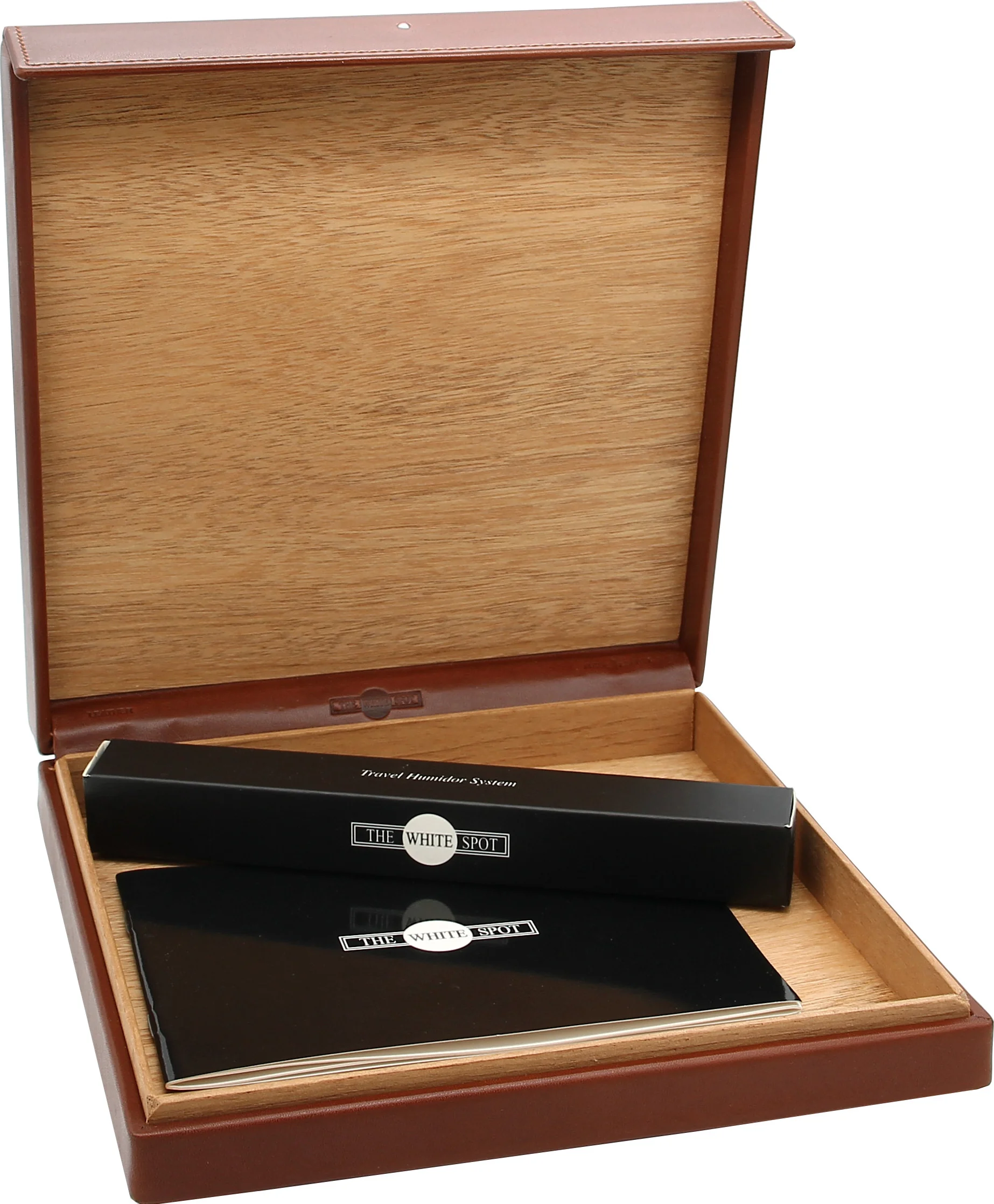 This elegant brown travel humidor from the renowned English brand Dunhill is the perfect companion for traveling. Covered in the finest Spanish leather and lined with high-quality wood, it offers space and protection for approximately 10 cigars. The closure is a magnetic clasp hidden beneath the leather. The bulldog logo embossed into the leather is an unmistakable Dunhill trademark, as is the famous White Spot on the front of the humidor. A sophisticated travel humidor that stylishly protects your cigars and proves to be a reliable companion on all your travels and trips.