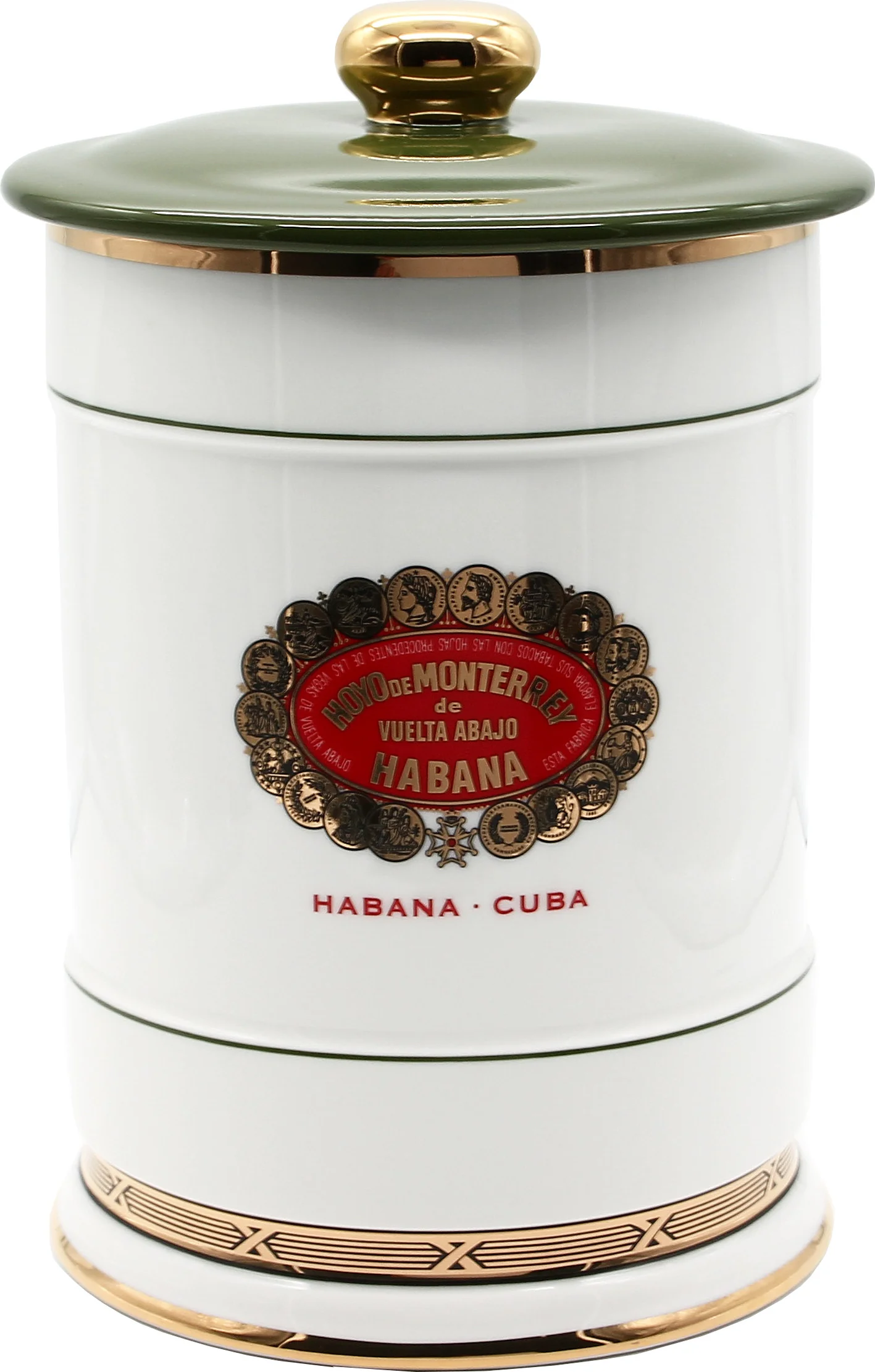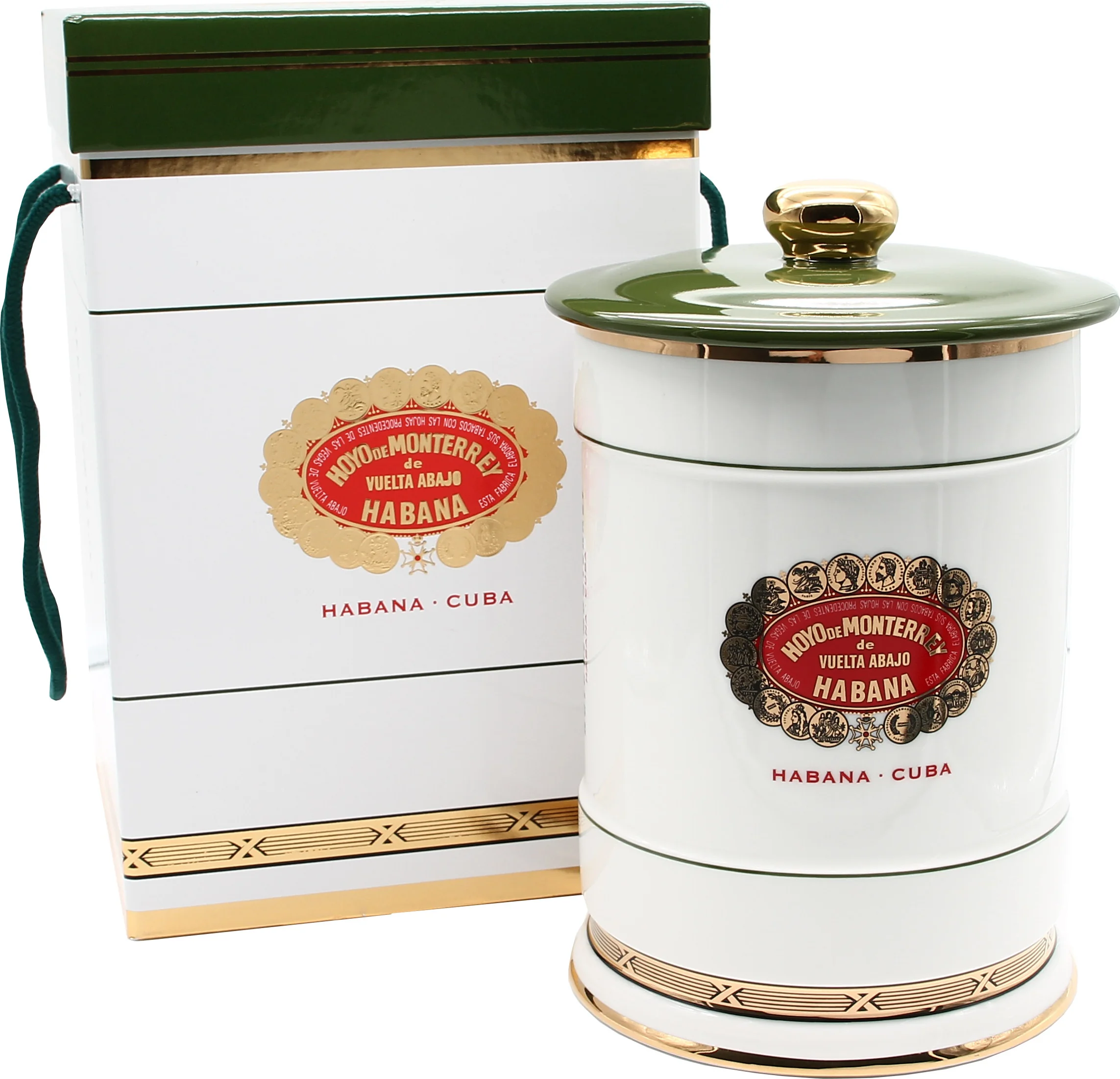 The Hoyo de Monterrey Porcelain Jar is a functional storage container for cigars from the Cuban brand Hoyo de Monterrey. It features white, green, and gold accents, complemented by the Hoyo de Monterrey logo on the front, ensuring brand recognition.