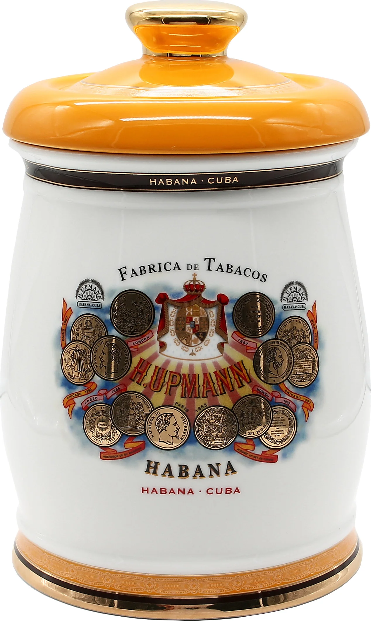 The H. Upmann Porcelain Jar is a functional and attractively designed storage container from the long-established Cuban brand H. Upmann. It features a white base color complemented by the brand's signature orange accents. The distinctive H. Upmann logo is prominently displayed on the front, clearly identifying the jar as belonging to the brand.