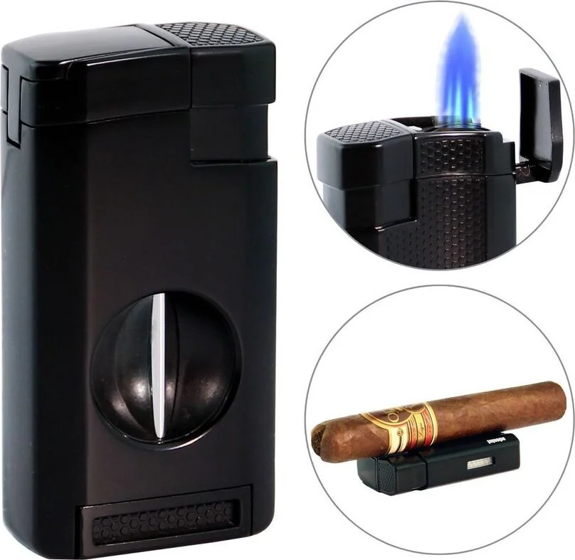 V-컷 기능(노치 컷이라고도 함)이 있는 풀아웃 시가 커터가 라이터에 통합되어 있습니다. 이 기능을 사용하면 모든 시가 형식을 손쉽게 절단할 수 있으며 라이터를 다기능 동반자로 만들 수 있습니다.