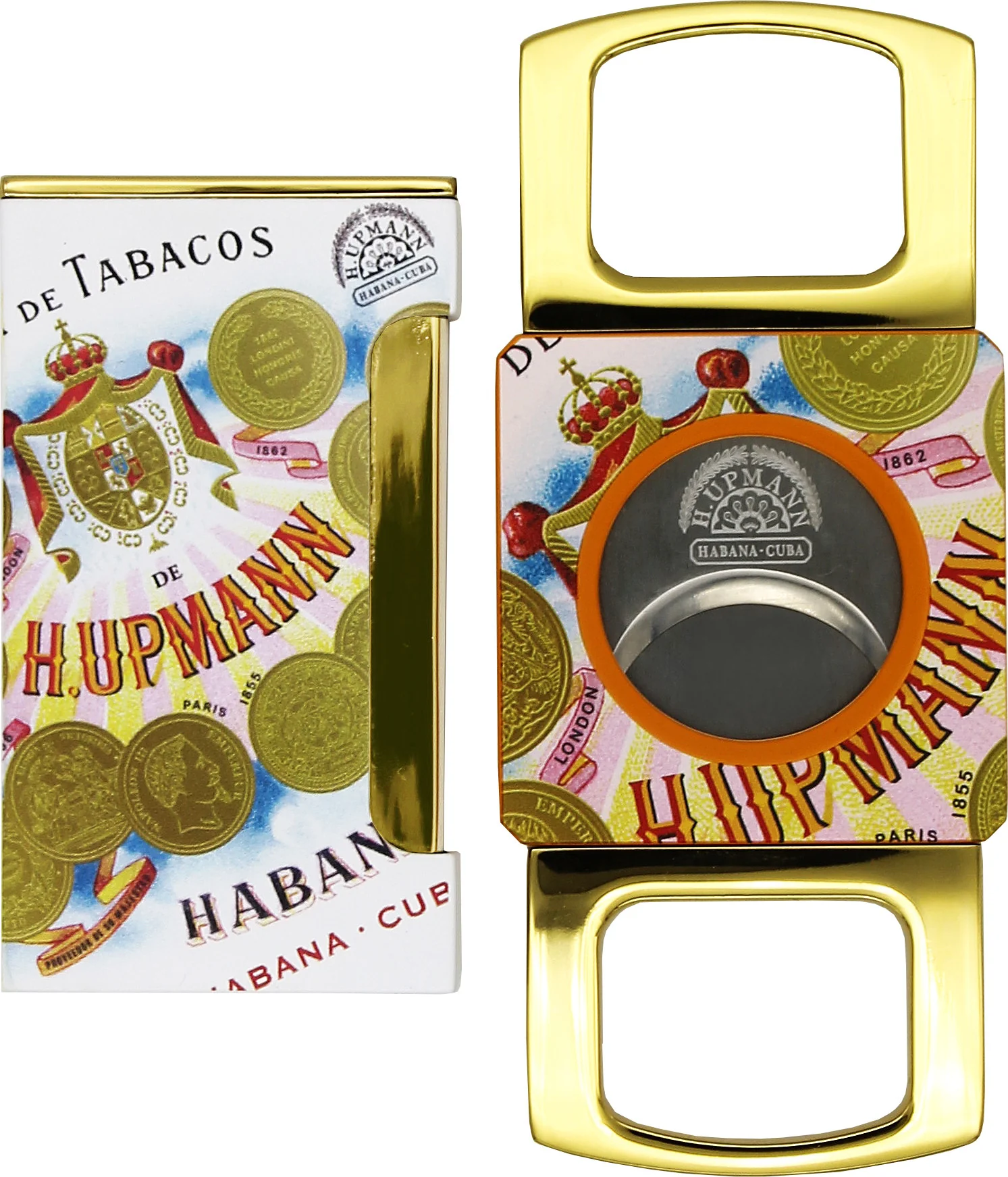 This H. Upmann lighter and cigar cutter set combines two high-quality accessories from the long-established Cuban cigar brand H. Upmann. Both components of the set feature the brand's signature H. Upmann medallion motifs and the brand logo in orange tones on both sides, creating a distinctive and iconic look.