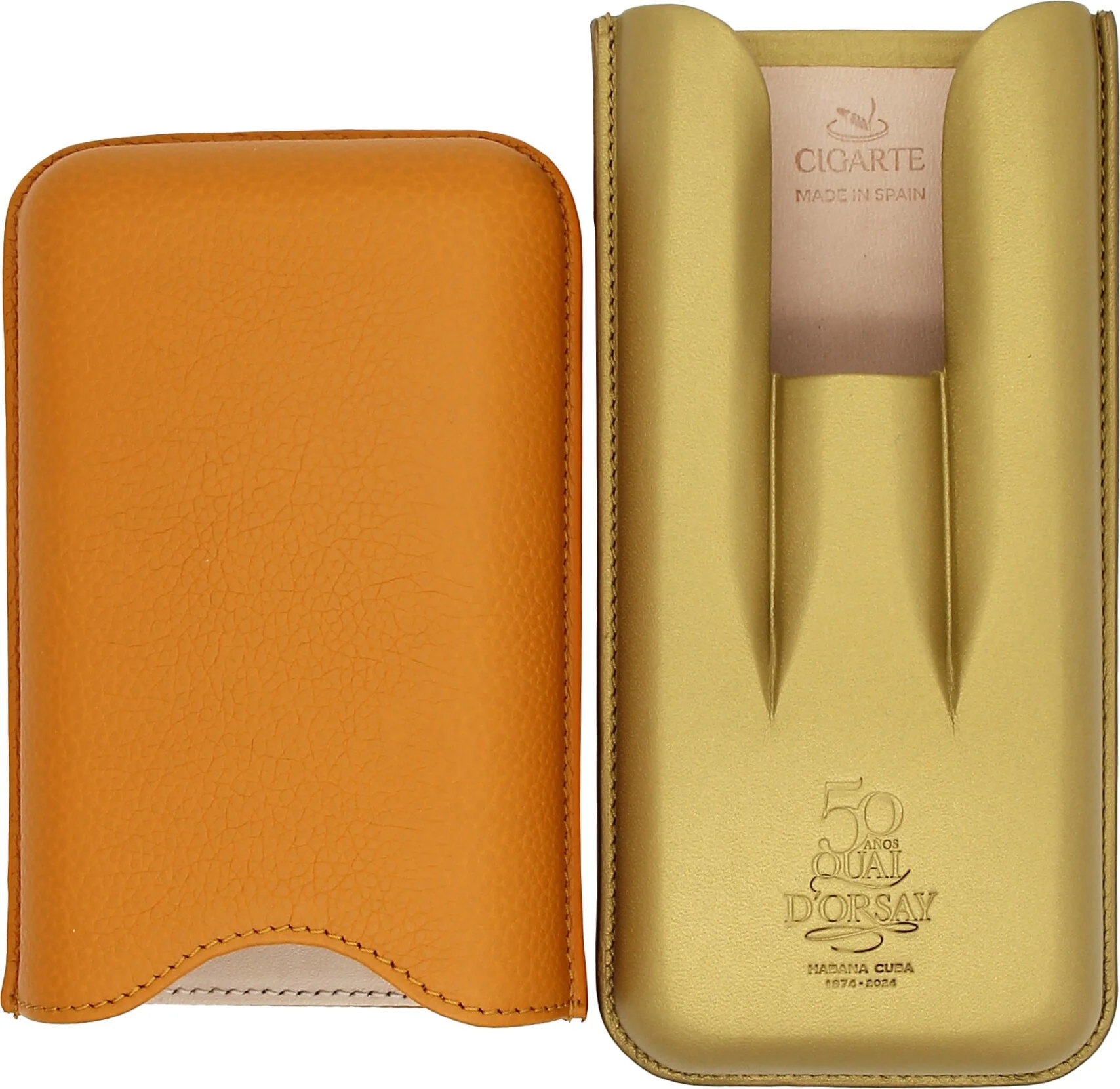 - **제조 및 디자인:** 이 케이스는 스페인의 스페인 회사 Cigarte에서 제조했습니다. 오렌지와 우아한 골드의 색상 조합이 특징이며, 상단은 엠보싱 가죽, 하단은 부드러운 가죽으로 제작되었습니다.