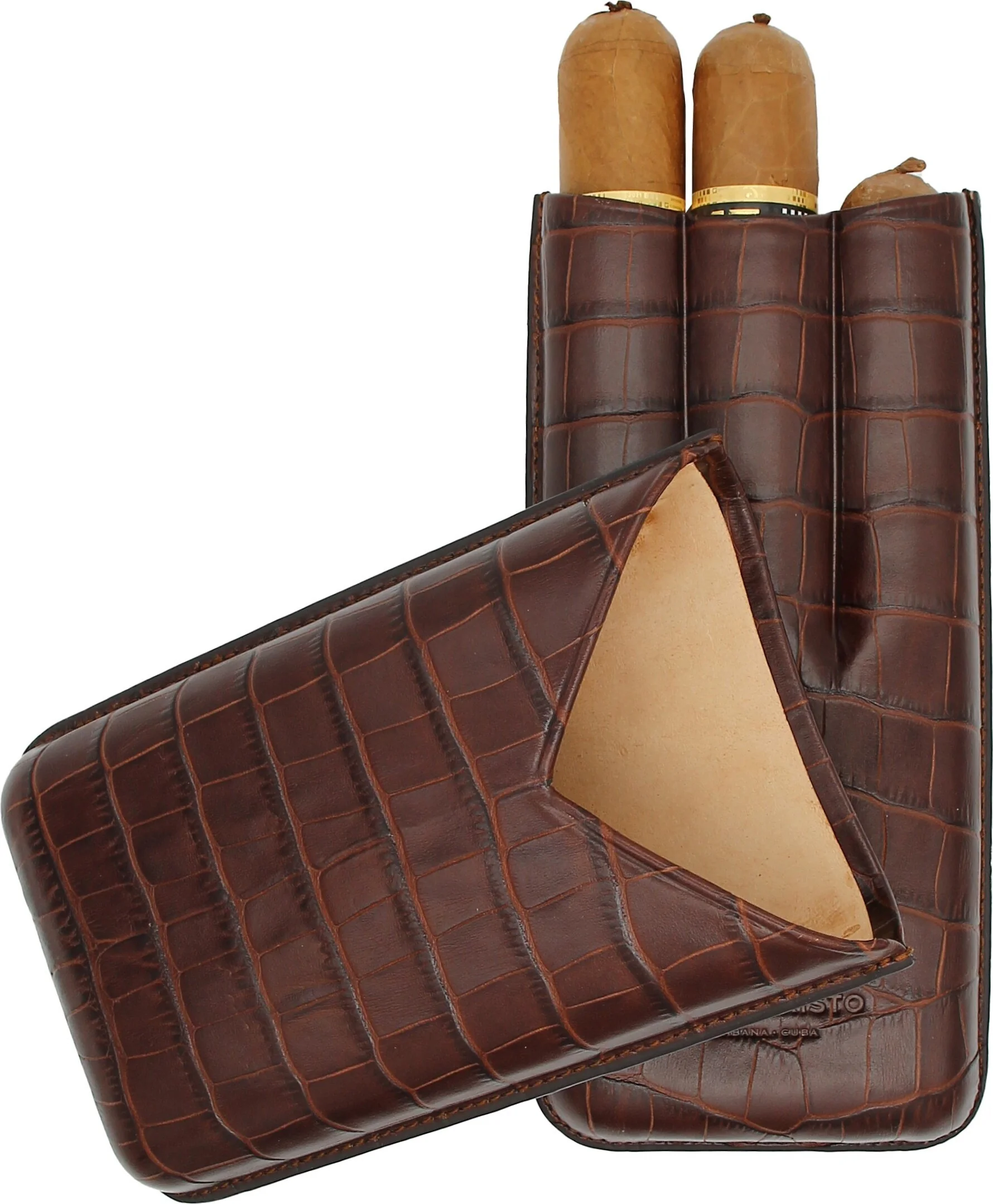 The Montecristo cigar case in timeless dark brown is a luxurious accessory from the Cuban cigar brand Montecristo. The finely textured leather surface with a crocodile-embossed pattern conveys an authentic, high-quality feel. The embossed brand logo, unmistakably representing Montecristo, adorns the front, lending the case an exclusive look.