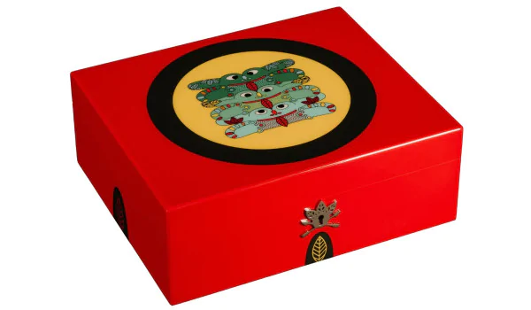 The Totem Humidor Healing Frog is an impressive piece of art in elegant red, multiple times high-gloss lacquered, and a centerpiece for any cigar enthusiast. With a capacity of up to 75 cigars, it is not only functional but also a stylish accessory.
